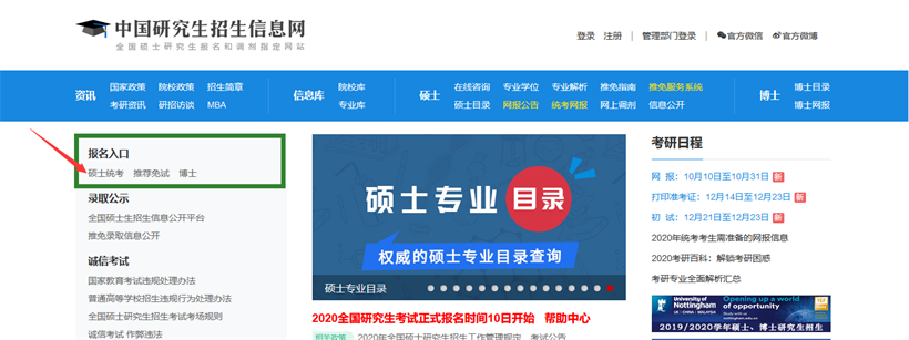 您好!2020年全国硕士研究生招生报名已正式开始,请您于10月31日前登陆中国研究生招生信息网报名: