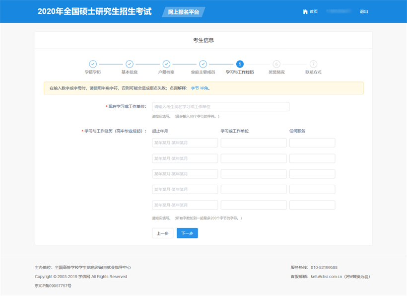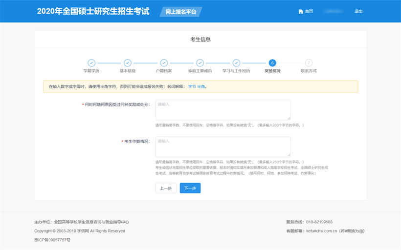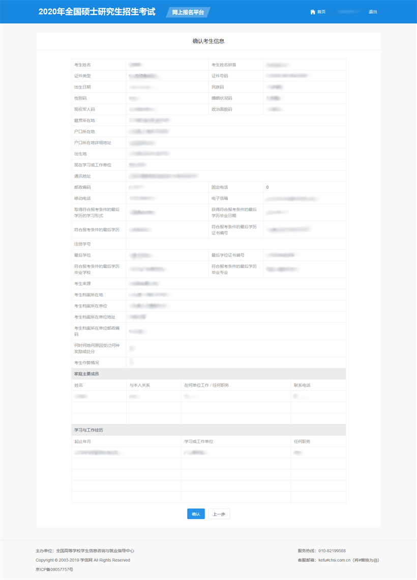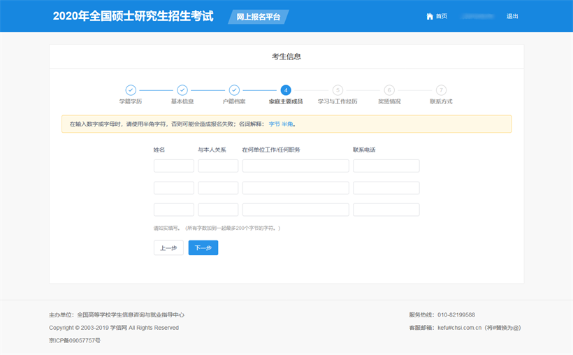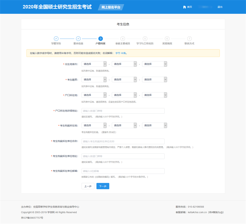 6、报名平台最上方为“考生信息”流程进度栏,包括:学籍学历、基本信息、户籍档案、家族主要成员、学习与工作经历、奖惩情况、联系方式等模块。