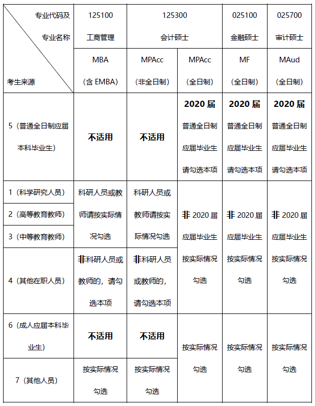 1) 考生来源按实际情况填写,一般情况下,报考MBA(含EMBA)、MPAcc非全日制的考生选择“其他在职人员”即可,报考MPAcc全日制/MF/MAud的考生按实际情况选择;
