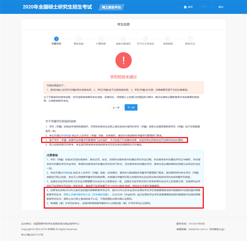 7、完成“学籍学历”信息填写后,点击“下一步”进入学历验证页面,请耐心等待验证结果。学历校验未通过仍可继续点击“下一步”,填写考生信息。