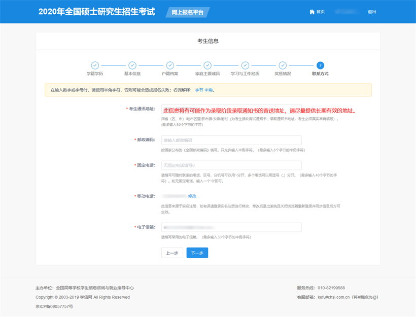 说明:“考生通讯地址”有可能作为录取阶段录取通知书的寄送地址,请尽量填写长期有效的地址。