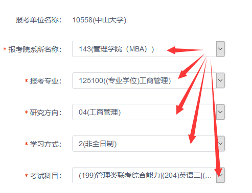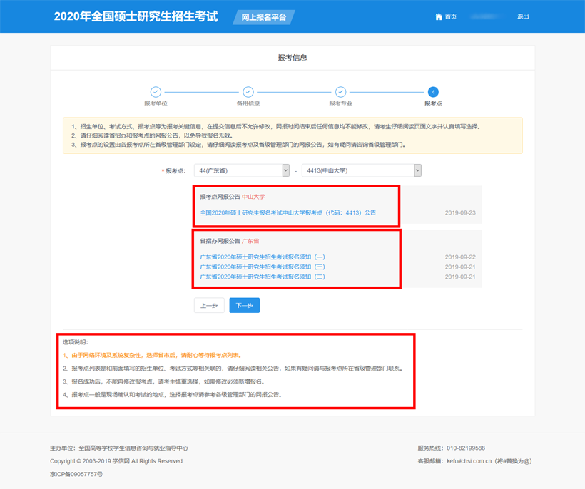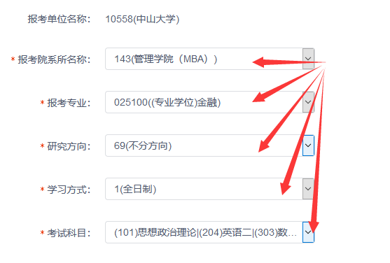 1) 招生单位:下拉菜单拉至最下方:44(广东省)10558(中山大学),并请仔细阅读相应的公告;