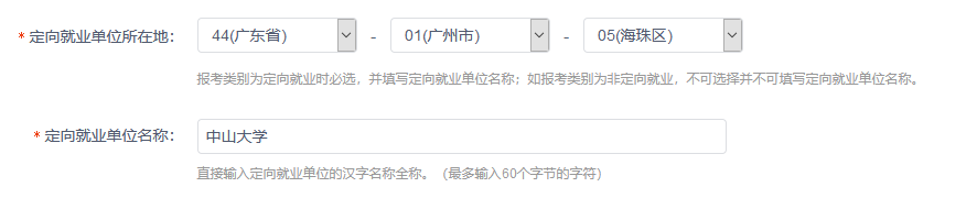 4) 定向就业单位信息按当前实际情况填写即可,如下示例: