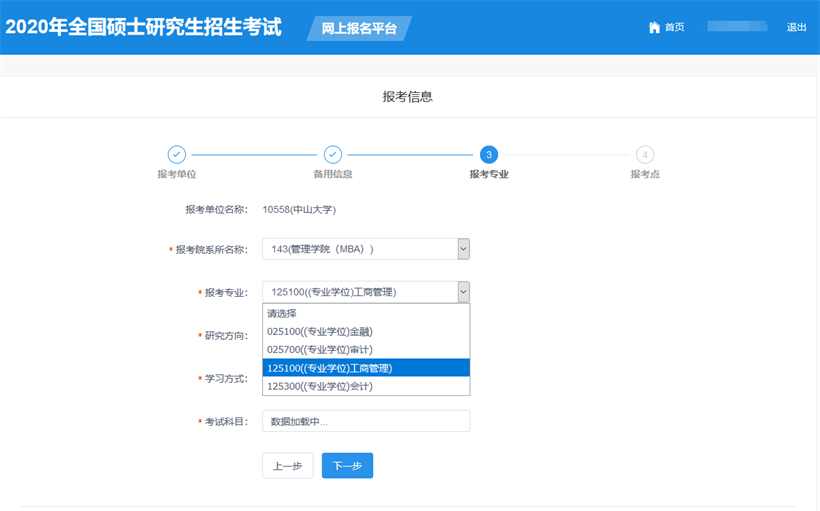 4)考试科目为系统自动关联,请考生选择后检查:除金融硕士考试科目为101-思想政治理论、204英语二、303数学三、431-金融学综合四门外,其他专业考试科目均为199-管理类联考综合能力、204-英语二两门;