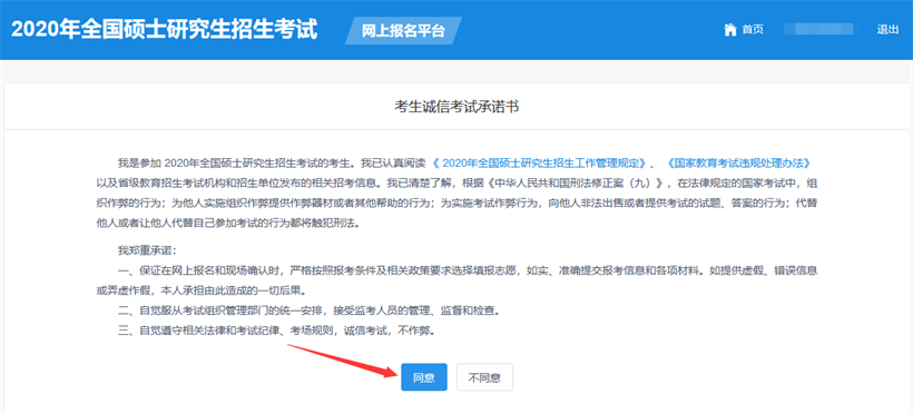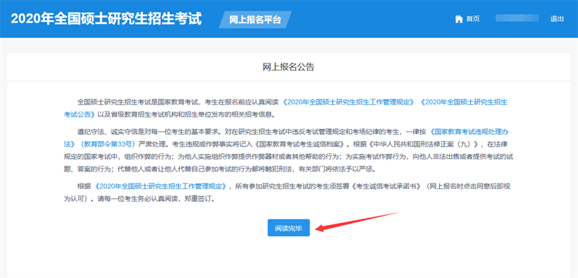 16、 请仔细阅读网上报名公告后,点击“阅读完毕”,进入考生诚信考试承诺页面,仔细阅读后。点击“同意”。