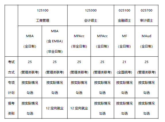 1) 金融、审计、工商管理、会计为四个不同的专业,按实际报考专业选择即可;