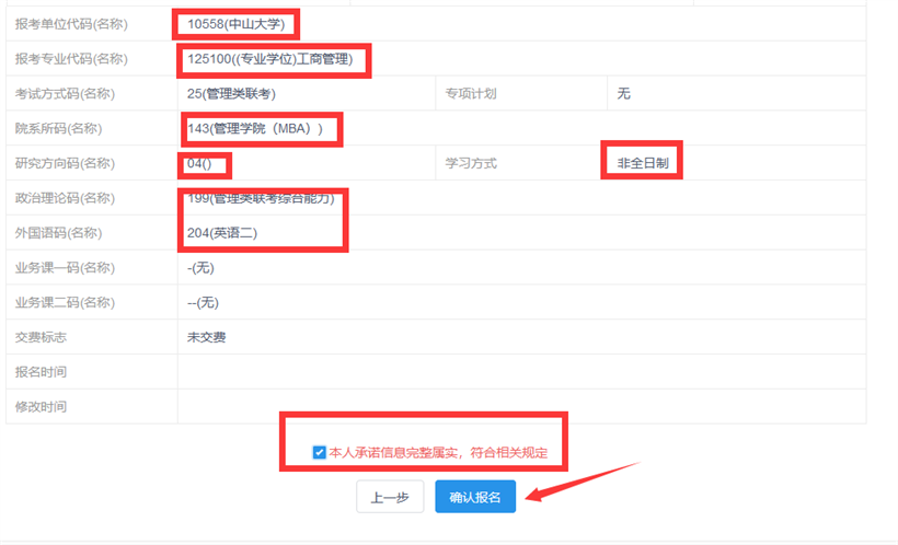 21、 最后确认报名信息:请按教育部、本人所在地省级教育招生考试管理机构、报考点以及报考招生单位的网上公告要求报名,凡不按公告要求报名、网报信息误填、错填或填报虚假信息而造成不能考试或复试的,后果由考生本人承担。报考信息一旦提交不可修改。