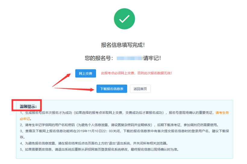 22、生成报名号后,按提示完成网上交费,报名完成。未成功交费的此次报名无效。建议下载报名信息表备用,现场确认时需将报名号一同带至现场。