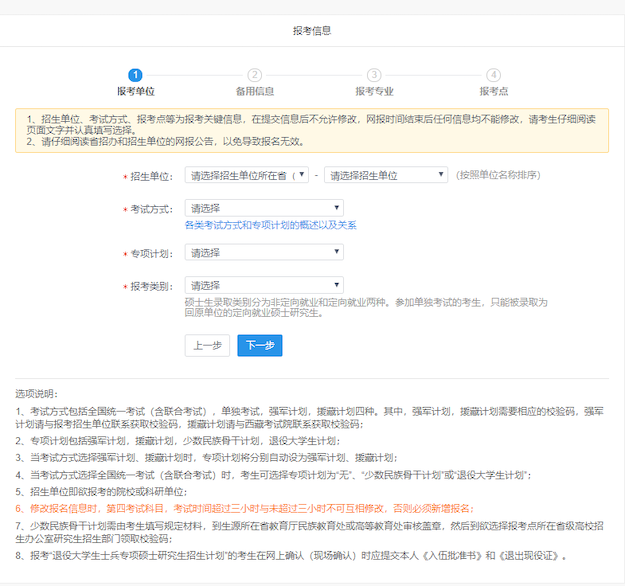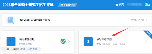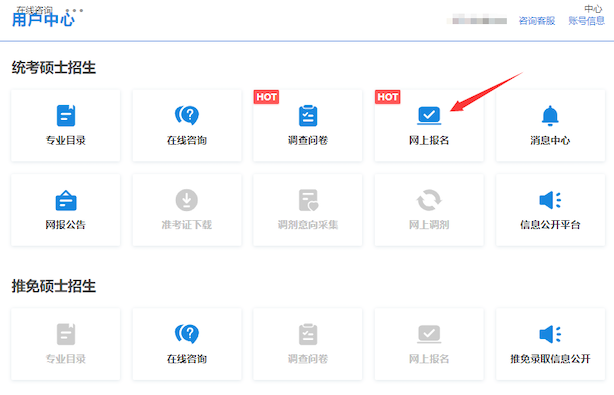 3、 登录后请先仔细阅读《网上调查》《专业目录》及《网报公告》等信息,如有问题可使用“在线咨询”功能;阅读完成后请点击“网上报名
