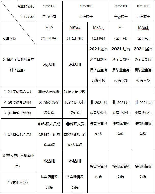 1) 考生来源按实际情况填写,一般情况下,报考MBA全日制/非全日制、MPAcc非全日制的考生选择“其他在职人员”即可,报考MPAcc全日制/MF/MAud的考生按实际情况选择;