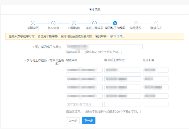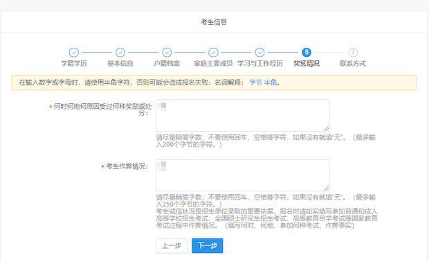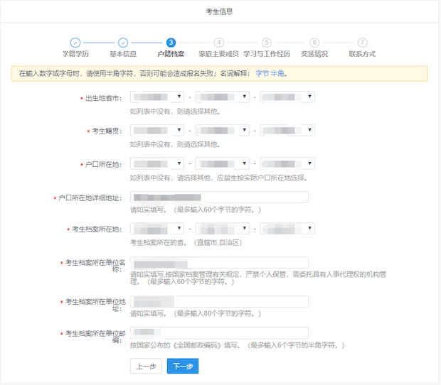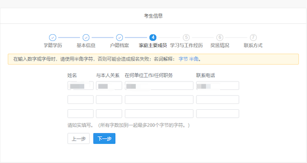 6、 报名平台最上方为“考生信息”流程进度栏,包括:学籍学历、基本信息、户籍档案、家族主要成员、学习与工作经历、奖惩情况、联系方式等模块。