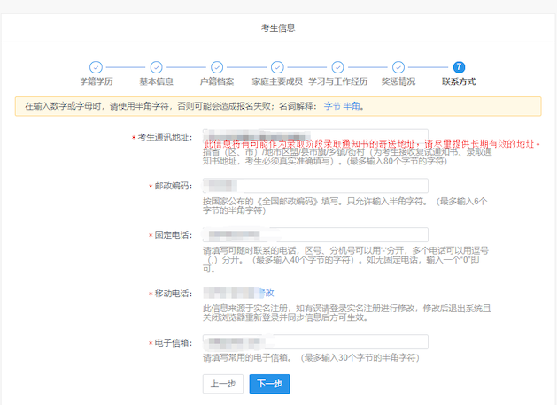 说明:“考生通讯地址”有可能作为录取阶段录取通知书的寄送地址,请尽量填写长期有效的地址。