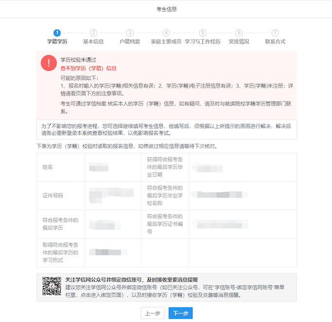 7、 完成“学籍学历”信息填写后,点击“下一步”进入学历验证页面,请耐心等待验证结果。学历校验未通过仍可继续点击“下一步”,填写考生信息。