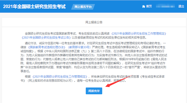 16、 请仔细阅读网上报名公告后,点击“阅读完毕”,进入考生诚信考试承诺页面,仔细阅读后。点击“同意”。