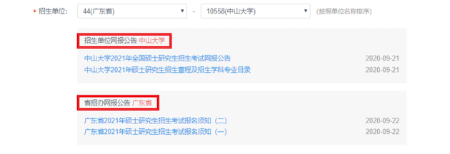 1) 招生单位:下拉菜单拉至最下方:44(广东省)10558(中山大学),并请仔细阅读相应的公告;