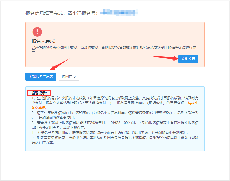 22、 生成报名号后,按提示完成网上交费,报名完成。未成功交费的此次报名无效。建议下载报名信息表备用,现场确认时需将报名号一同带至现场。