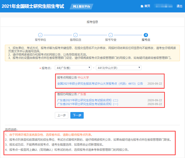 1) 中山大学报考点网上确认考生报名信息的时间初定为2020年11月6日至11月10日,选择中山大学报考点的考生须在规定时间内按照中山大学报考点规定的网上确认方式提供相关材料、核对并确认其网报信息。具体时间和要求请留意中山大学报名点的后续公告,详情请查阅:《全国2021年硕士研究生报名考试中山大学报考点(代码:4413)公告》;