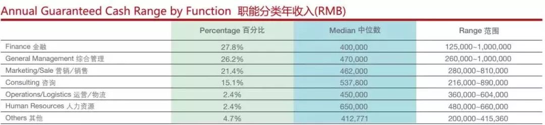 具体职务也会有所影响,年薪中位数前5名分别为人力资源(650000)、咨询(537800)、综合管理(470000)、营销/销售(462000)、运营/物资(450000)